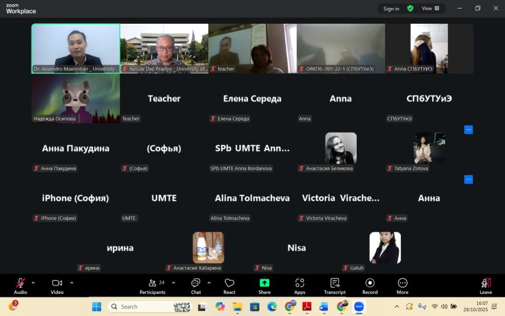 BANDAR LAMPUNG, (fkip.unila.ac.id) – Dosen Program Studi Magister Pendidikan Bahasa Inggris (PBI) Fakultas Keguruan dan Ilmu Pendidikan (FKIP) Universitas Lampung (Unila), Aksendro Maximilian, S.Pd., M.Pd., Ph.D., menorehkan prestasi di kancah internasional. Dr. Aksendro diundang menjadi pembicara dalam “International Guest Lecture” yang diselenggarakan oleh Saint Petersburg University of Management, Technology, and Economics (UMTE) Rusia. Kegiatan ini dilaksanakan secara daring melalui platform Zoom Meeting pada Rabu, 29 Oktober 2025.