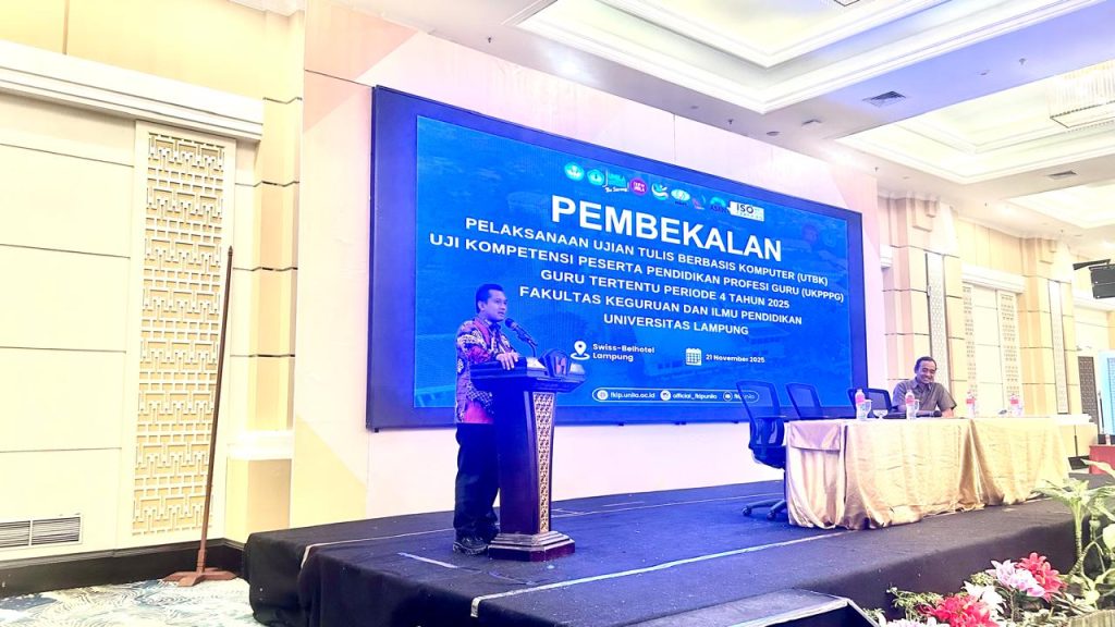 (Eduspot fkip.unila.ac.id): Bandar Lampung, Fakultas Keguruan dan Ilmu Pendidikan (FKIP) Universitas Lampung kembali menyelenggarakan kegiatan Pembekalan Pelaksanaan Ujian Tulis Berbasis Komputer (UTBK) Uji Kompetensi Peserta Pendidikan Profesi Guru (UKPPG) Guru Tertentu Periode 4 Tahun 2025 pada Jumat (21/11) di Swiss-Belhotel Lampung yang di ikuti oleh puluhan dosen FKIP Universitas Lampung. Kegiatan ini dimulai pukul 13.00 WIB dan diawali dengan pembukaan oleh MC yang kemudian dilanjutkan dengan rangkaian acara resmi.
